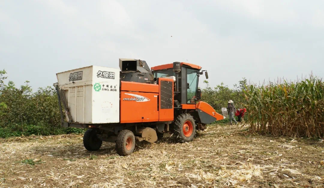 在作业田里,只见玉米联合收割机轰鸣前行,一簇簇玉米被农机吃进“肚子”,摘穗剥皮,金黄籽粒倾泻而出。