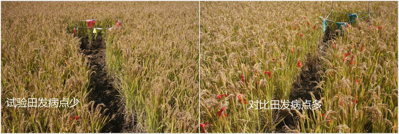 在80多位农户线下见证和近7000人线上关注中,中农立华的农技服务人员下到田里,随机在试验田和对比田平行的位置开了一道2米长的垄,查找发病点并在发病点系上红绳标记,最终结果显示,使用常规管理的对照田水稻发病点有30余个,而使用富士一号®黄金装的水稻发病点只有个别几处。