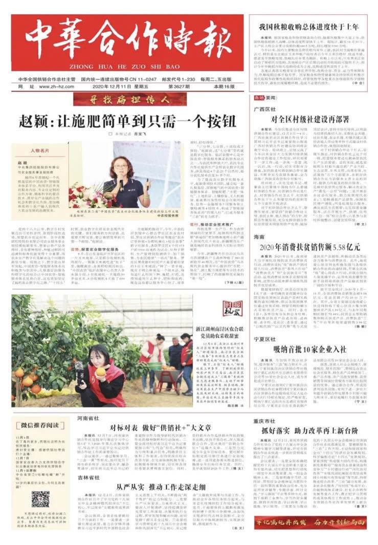 12月11日,《中华合作时报》头版头条刊发赵颖作为中国农资·智能服务体系平台的搭建者,用实际行动践行着供销合作社的初心与使命,诠释着新时代供销合作社的责任与担当。