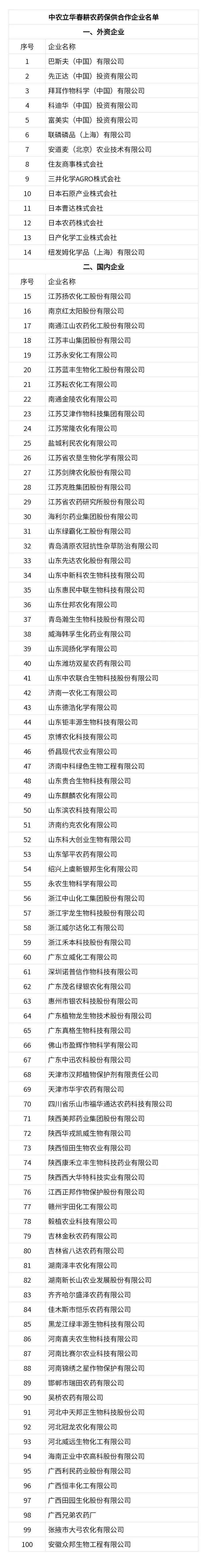 目前已有63家国内知名化肥生产企业与中农控股签订了《2021年春耕化肥保供合作协议》,100家国内外农药主要生产企业与中农立华签订《2021年春耕农药保供合作协议》(名单附后)。