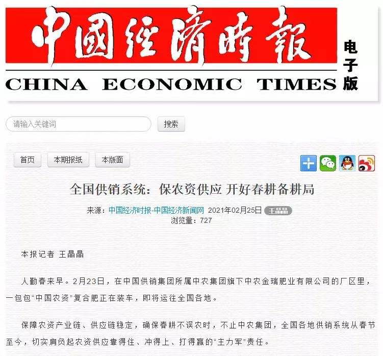 2月25日,中国经济时报刊发报道《全国供销系统:保农资供应 开好春耕备耕局》,提到中农集团“不误农时,保障农资产业链、供应链稳定”。