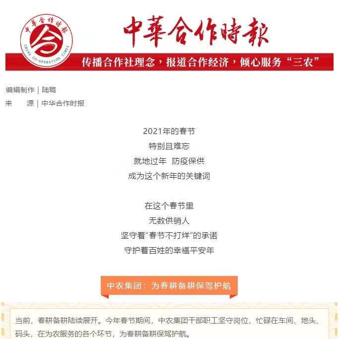 2月21日,中华合作时报微信公众号刊发《2021年新春背后的供销守护者》,报道了中农集团干部职工忙碌在车间、地头、码头等为农服务各环节,为春耕备耕保驾护航。