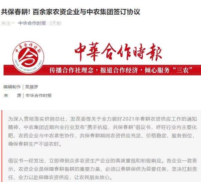2月24日,中国商报官方网站中国商网刊发报道《春耕农时不可误 多措并举保农资》,提到中农集团“不误农时,保障农资产业链、供应链稳定”。