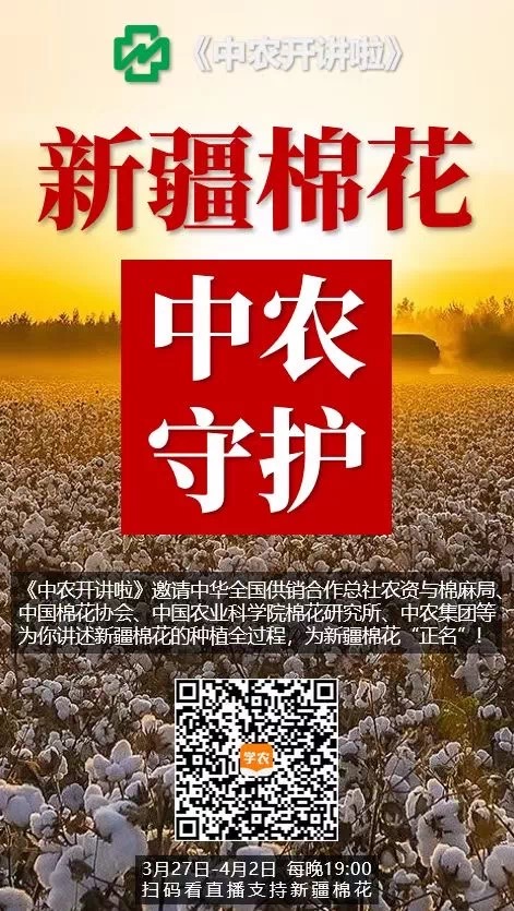 支持新疆棉花先从了解新疆棉花开始。3月28日,中农集团迅速推出《中农开讲啦》第二期——“新疆棉花 中农守护”系列讲座,为新疆棉花正名。