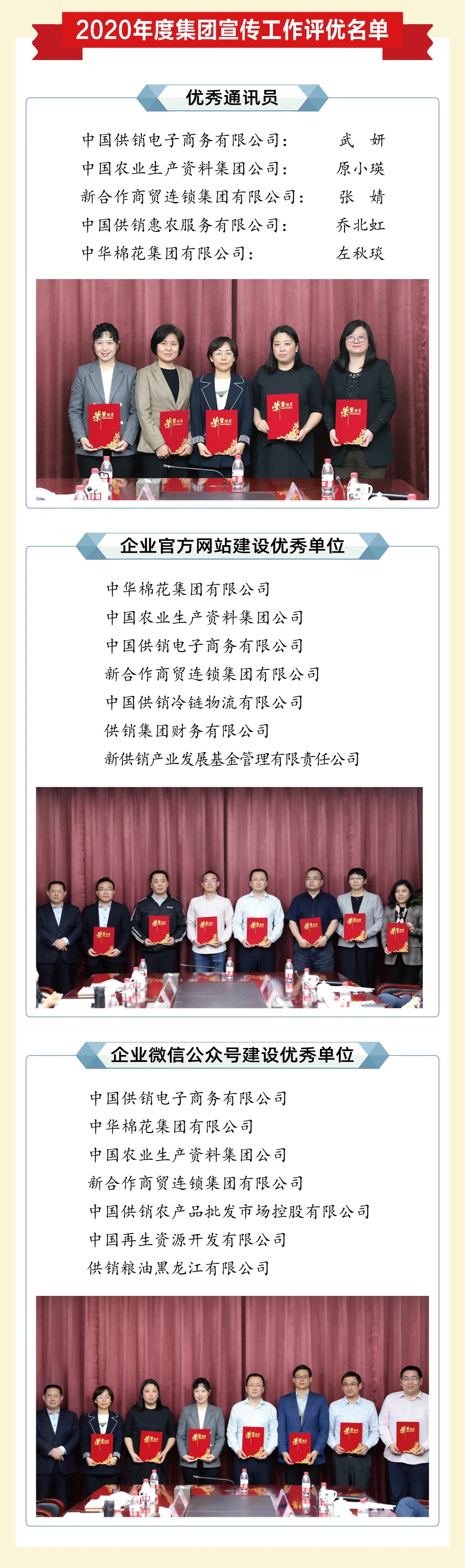 会议对供销集团2020年度先进单位和个人进行了表彰。此次供销集团评选出“企业官方网站建设优秀单位”7个、“企业微信公众号建设优秀单位”7个、“2020年度优秀通讯员”5个。其中,中农集团获得“企业官方网站建设优秀单位”和“企业微信公众号建设优秀单位”两项荣誉,集团研究发展中心原小瑛获评“2020年度优秀通讯员”。