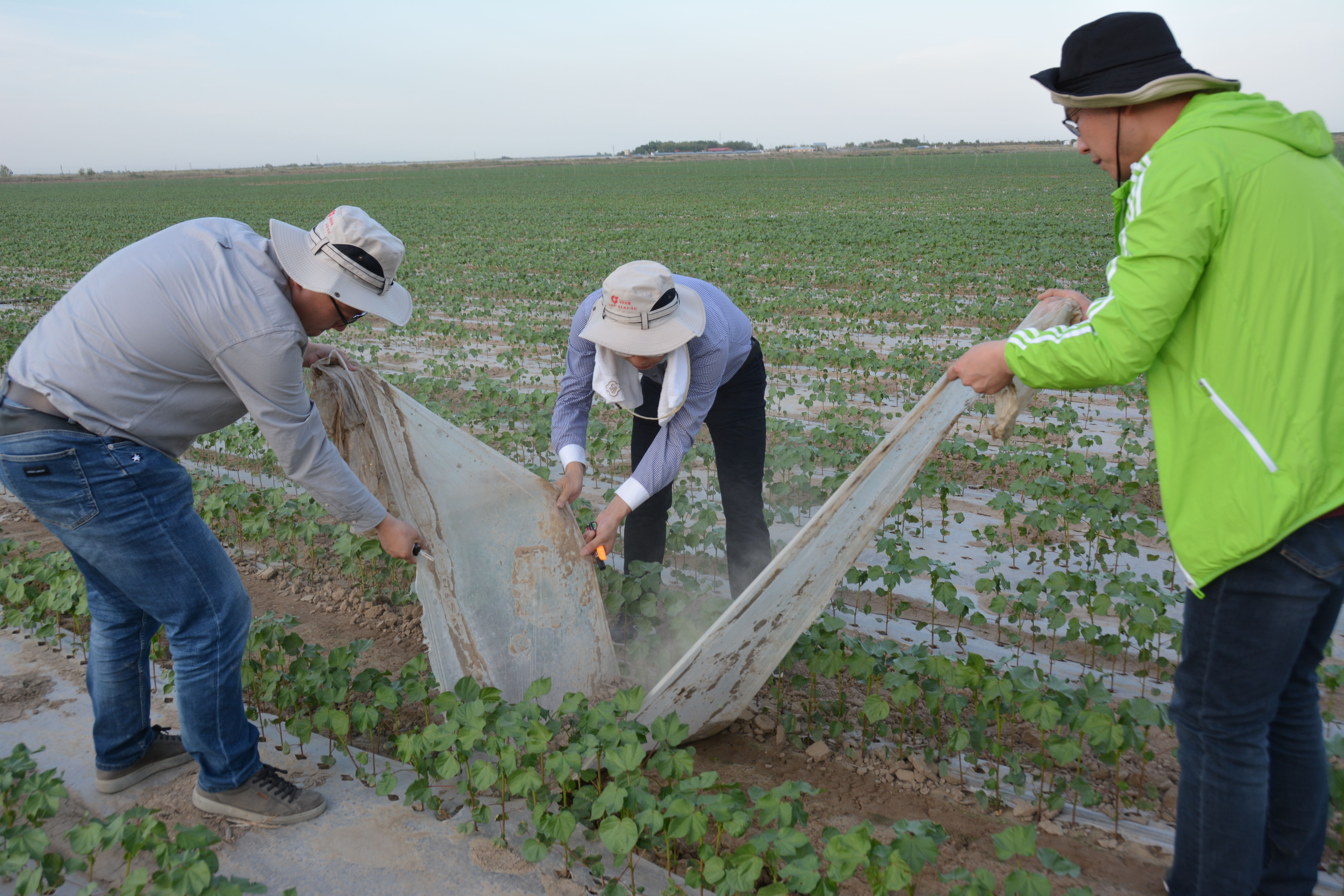 随后中农通用、博禄公司、乌苏市农业农村局下属农业技术站相关工作人员,顶着烈日在项目试验区域开展作物生长数据、膜内地温、湿度等数据的测量采集工作,并在对比组区域按照计划要求采集了部分地膜样品,样品将发往博禄公司上海实验室进行各项数据的检测。
