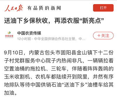 9月28日,人民日报客户端、新华网客户端刊发《送油下乡保秋收,再添农服“新亮点”》,报道了中农集团旗下中国供销石油公司首次联合地方供销社在市级范围开展送油下乡,大幅提升了服务范围和针对性,成为中农集团开展为农服务工作的新亮点和大胆创新。