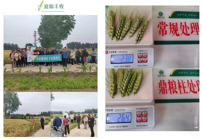 风吹麦浪,满目金黄。近期,河南永城市顺和镇的小麦示范田里人头攒动,经过一系列的测产、对照,中农立华“中农鼎粮柱”方案使用后的小麦成穗率高,籽粒饱满,一穗可多结2-4个籽,每亩最高增产140斤,各项优异表现赢得现场农户的认可。