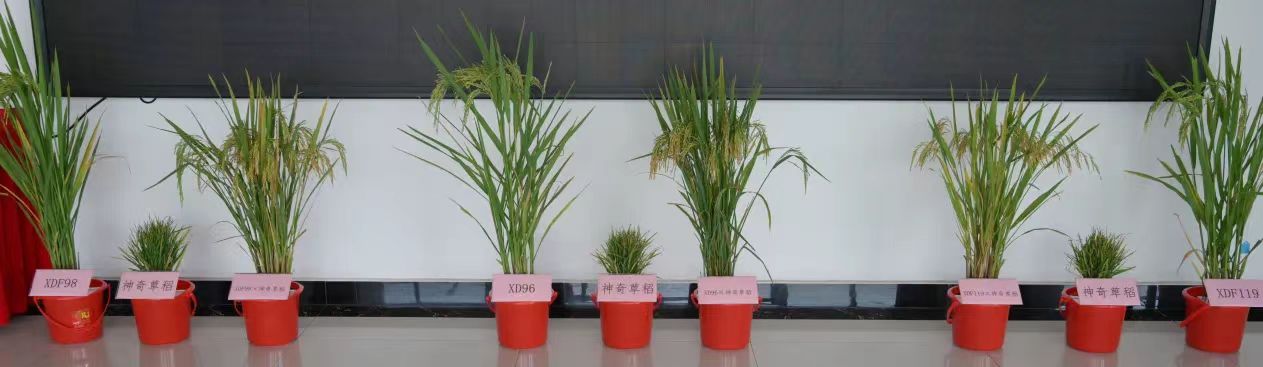 在中农种业南昌生物育种试验基地,展示着4组神奇草稻改良材料与原始植株的对照试验结果。江西现代种业股份有限公司副总经理张玮说:“大田的有效产量一看有效穗,二看穗粒数,三看千粒重。通过神奇草稻改良的株高降了20~30公分,早发多蘖,提高了有效穗,产量增长预计非常可观。”