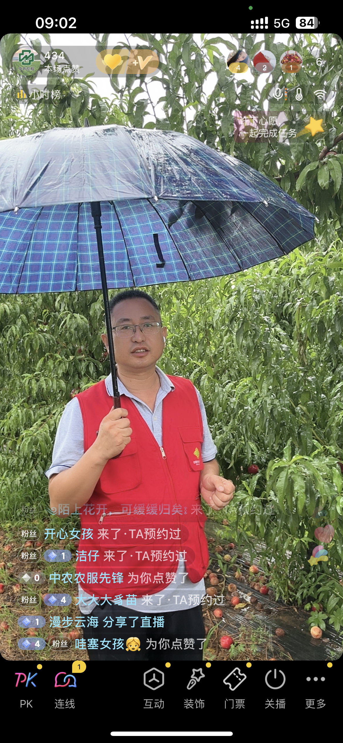 在北京平谷桃园直播时,有一次突遇大雨,当时直播间在线人数较多,为了促成更多的订单,农业服务事业部贺跃鹏坚持冒雨直播,得到多方认可。