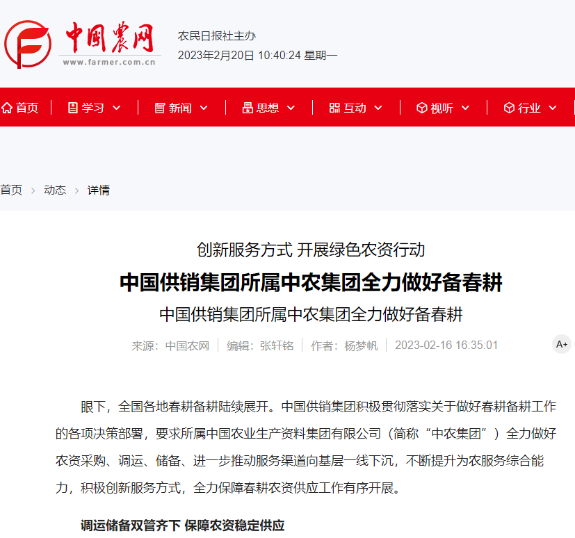 眼下,全国各地春耕备耕陆续展开。中国供销集团积极贯彻落实关于做好春耕备耕工作的各项决策部署,要求所属新利集团官网(简称“中农集团”)全力做好农资采购、调运、储备、进一步推动服务渠道向基层一线下沉,不断提升为农服务综合能力,积极创新服务方式,全力保障春耕农资供应工作有序开展。
