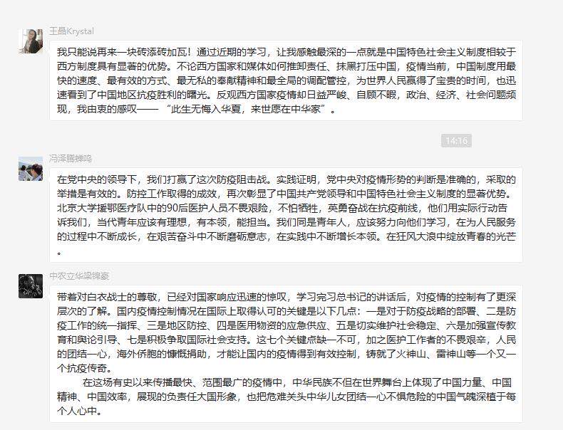 通过交流,大家一致认为,党和国家用最快的速度、最有效的方式、最无私的奉献精神和最全局的调配管控在最短的时间内遏制了疫情,为世界人民赢得了宝贵时间,再次彰显了中国特色社会主义制度的独特优势。在这场人民战“疫”中,广大青年用实际行动充分证明,我们是有远大理想的一代,是有家国情怀的一代,更是能担当大任的一代。北京大学援鄂医疗队中的90后医护人员不畏艰险,不怕牺牲,英勇奋战在抗疫前线,他们用实际行动告诉大家,当代青年有理想、有本领,能担当。