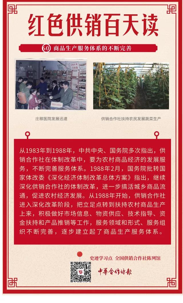 随着新的经营体制在农村的推行,农民群众有了更大的生产和经营自主权,各地农村很快涌现出一大批乡镇企业,也涌现出一大批生产和经营专业户。我国农村开始朝着专业化、商品化、社会化生产方向转变。但是,在流通领域中还存在着许多不协调、不适应的地方。 如何让农村经济实现新的增长?如何才能巩固和扩大改革成果,促进农业生产?1987年1月22日,中共中央政治局通过了《把农村改革引向深入》的文件,把确立农民自主权,发展市场体系,优化产业结构作为农村改革和发展的重点目标。文件要求“供销合作社要按照合作社原则,尽快办成农民的合作商业组织,完善商品生产服务体系。” 1988年2月,国务院批转国家体改委《深化经济体制改革总体方案》指出:“按照改官办为民办的方向,继续深化供销合作社的体制改革,完善为农村商品生产服务的体系和农副产品合同定购制度,积极推行联合经营和代理购销,进一步搞活城乡商品流通,促进农村经济发展。” 从1988年开始,供销合作社进入深化改革阶段,主要内容是完善商品生产服务体系,办成农村的综合服务中心。 |