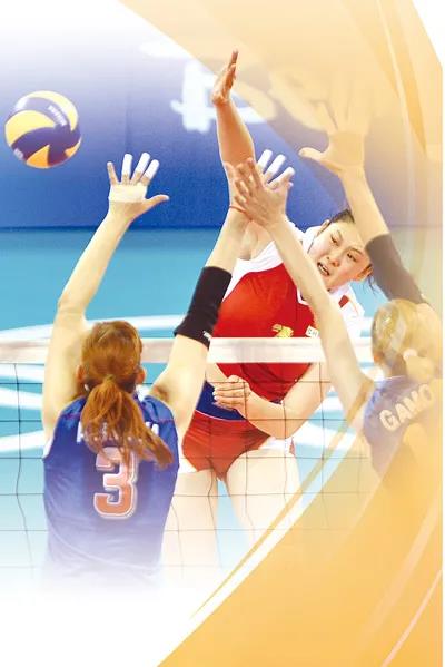 2008年8月19日,中国女排选手在北京奥运会女子排球赛中扣球。人民日报记者李舸摄