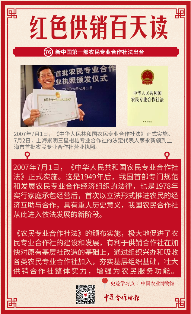 2007年7月2日,上海市颁发首批农民专业合作社营业执照。崇明三星柑桔专业合作社的法定代表人茅永新高兴地领到上海市首批营业执照。