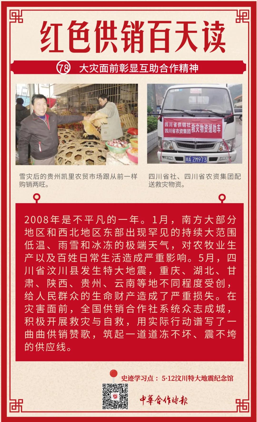 1949年,新中国成立初期,供销合作社就曾在举国遭受各种严重自然灾害时,通过扶持群众生产救灾赢得了民心、扩大了组织。1976年唐山大地震中,供销合作社在短时间内调配、集结城乡物资,有力地支援了灾区。2008年,面对各种灾害救援任务和重大保供任务,供销合作社人用实际行动再次谱写了一曲曲供销赞歌,筑起一道道冻不坏、震不垮的供应线。