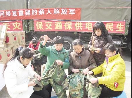 凝冻后,贵州省社工作人员为抢修电力的官兵缝补衣服