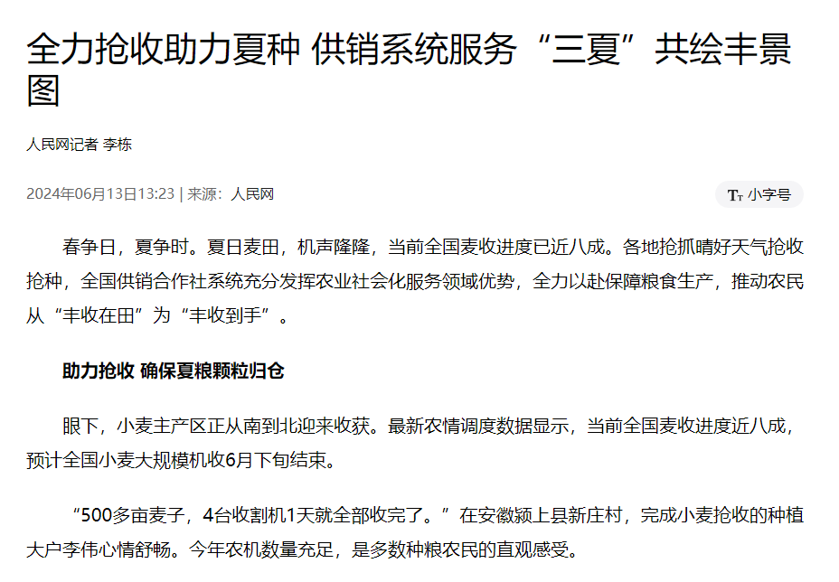 春争日,夏争时。夏日麦田,机声隆隆,当前全国麦收进度已近八成。各地抢抓晴好天气抢收抢种,全国供销合作社系统充分发挥农业社会化服务领域优势,全力以赴保障粮食生产,推动农民从“丰收在田”为“丰收到手”。