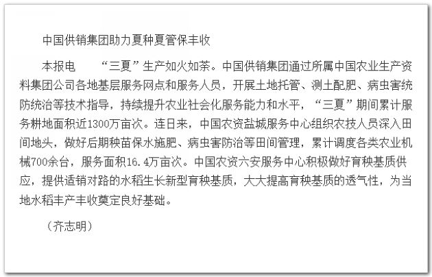 “三夏”生产如火如荼。中国供销集团通过所属中国农业生产资料集团公司各地基层服务网点和服务人员,开展土地托管、测土配肥、病虫害统防统治等技术指导,持续提升农业社会化服务能力和水平,“三夏”期间累计服务耕地面积近1300万亩次。连日来,中国农资盐城服务中心组织农技人员深入田间地头,做好后期秧苗保水施肥、病虫害防治等田间管理,累计调度各类农业机械700余台,服务面积16.4万亩次。中国农资六安服务中心积极做好育秧基质供应,提供适销对路的水稻生长新型育秧基质,大大提高育秧基质的透气性,为当地水稻丰产丰收奠定良好基础。