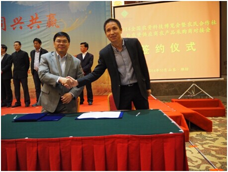 10月14日,在山东潍坊举办的“2014全国农资科技博览会暨农民合作社与农资供应商、农产品采购商对接会”上,中农控股副总经理、中农高夫董事长曲道伟代表中农高夫与以色列耐特菲姆公司中国区总经理曾秋朋签署了战略合作协议,双方就全面引进和推广耐特菲姆公司节水灌溉设备达成一致意见。
