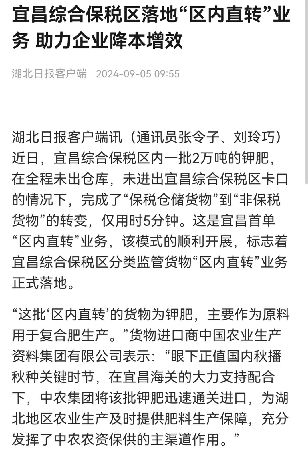 这批区内直转的货物为2万吨钾肥,主要作为复合肥企业生产原料。在宜昌海关的大力配合下,中农控股仅用5分钟的时间将该批钾肥迅速通关进口,实现了“保税仓储货物”到“非保税货物”的转变。