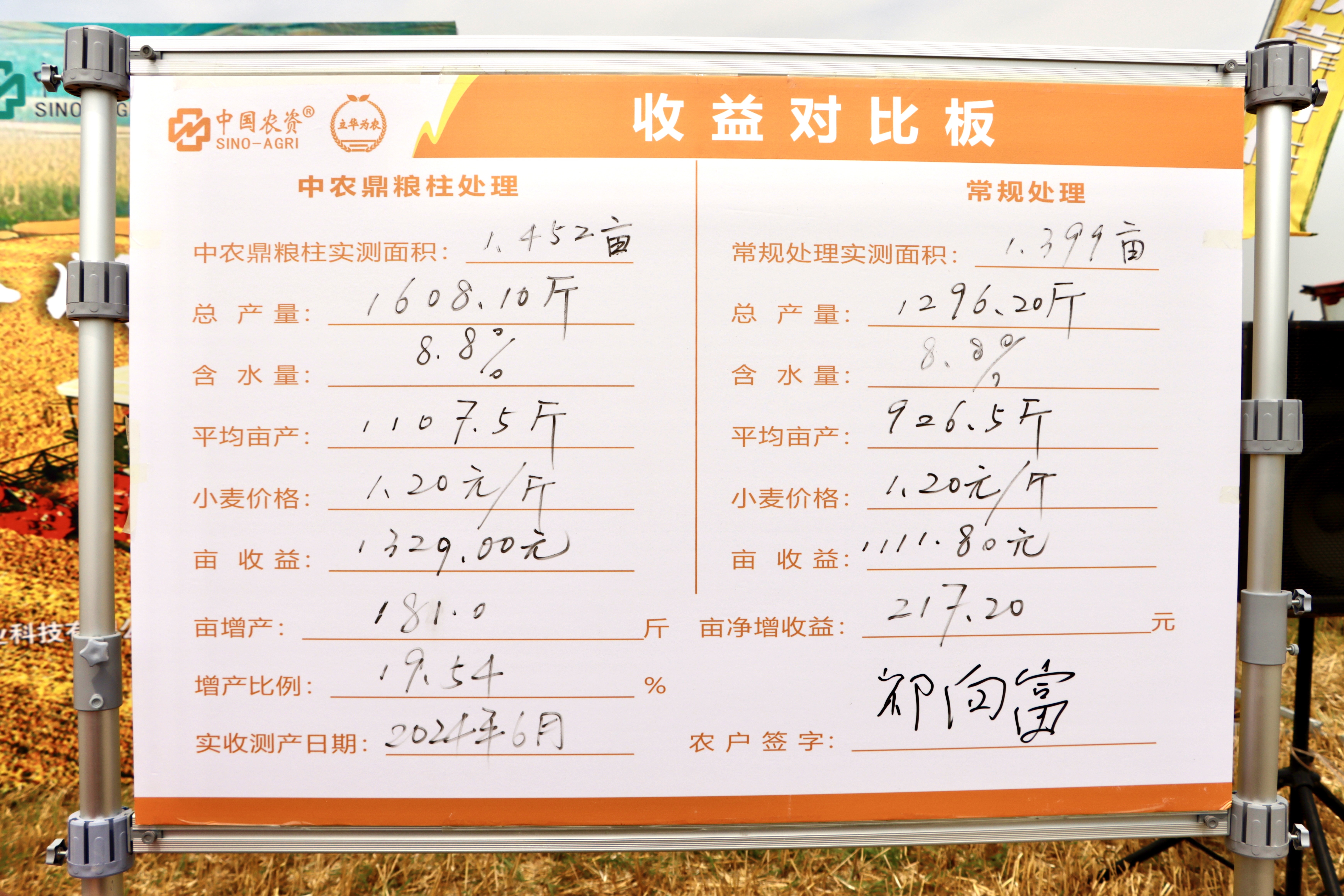 祁向富在大碱厂镇种植小麦、玉米已十余年,但产量一直难以提升。直到他与武清服务中心合作,用上了服务中心推荐的“中农鼎粮柱”作物解决方案,产量得到了明显提高。“今年,我家的小麦示范田迎来了大丰收,平均亩产1107.5斤,而常规对照的小麦田亩产仅为926.5斤,每亩增产了181斤。按小麦1.2元/斤的市场价计算,我家的小麦每亩增加了217元的收入。”祁向富高兴地说。