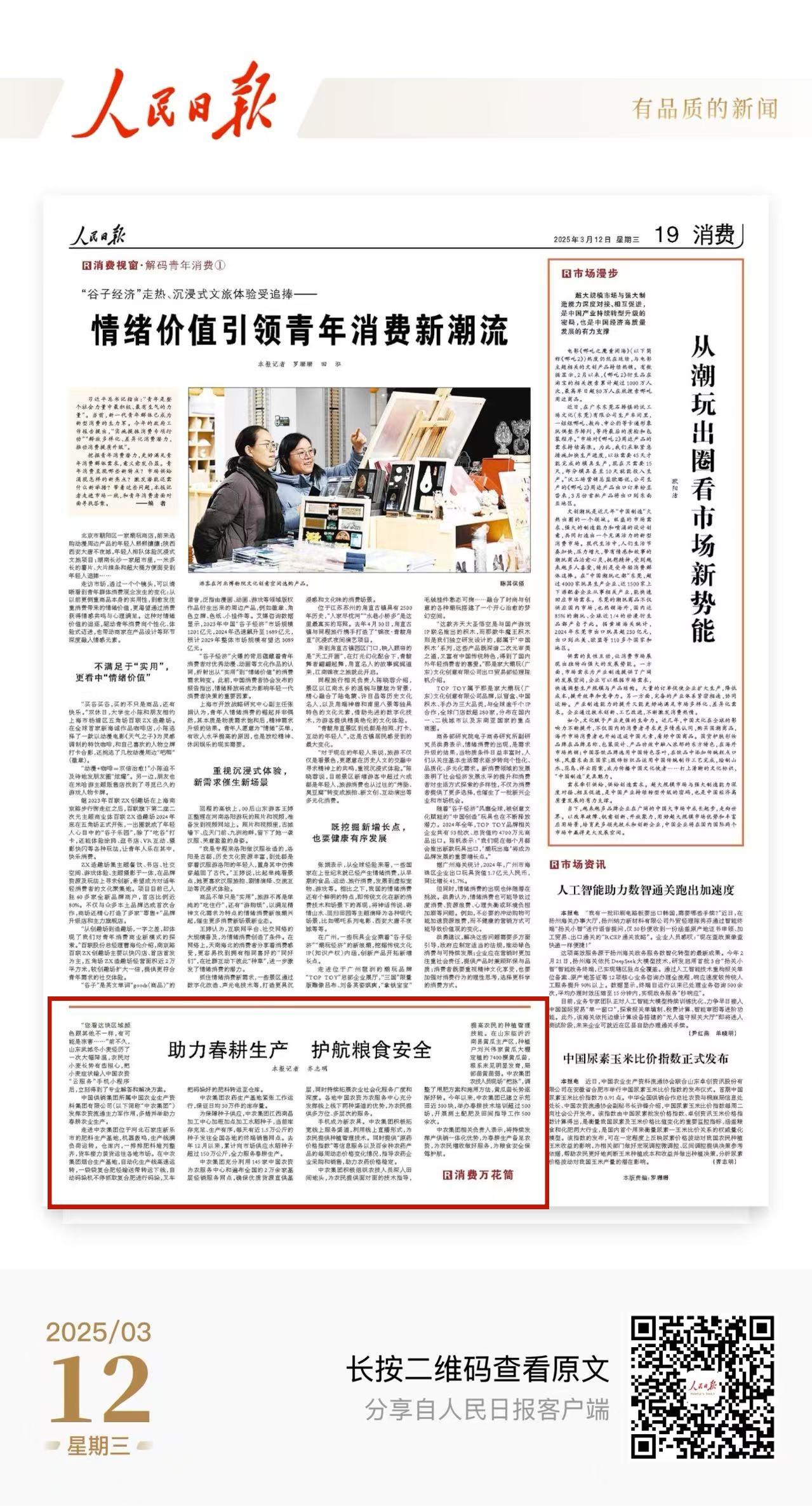 3月12日,《人民日报》第19版刊发《助力春耕生产护航粮食安全》,报道了中农集团发挥农资流通主力军作用,多措并举助力春耕农业生产。