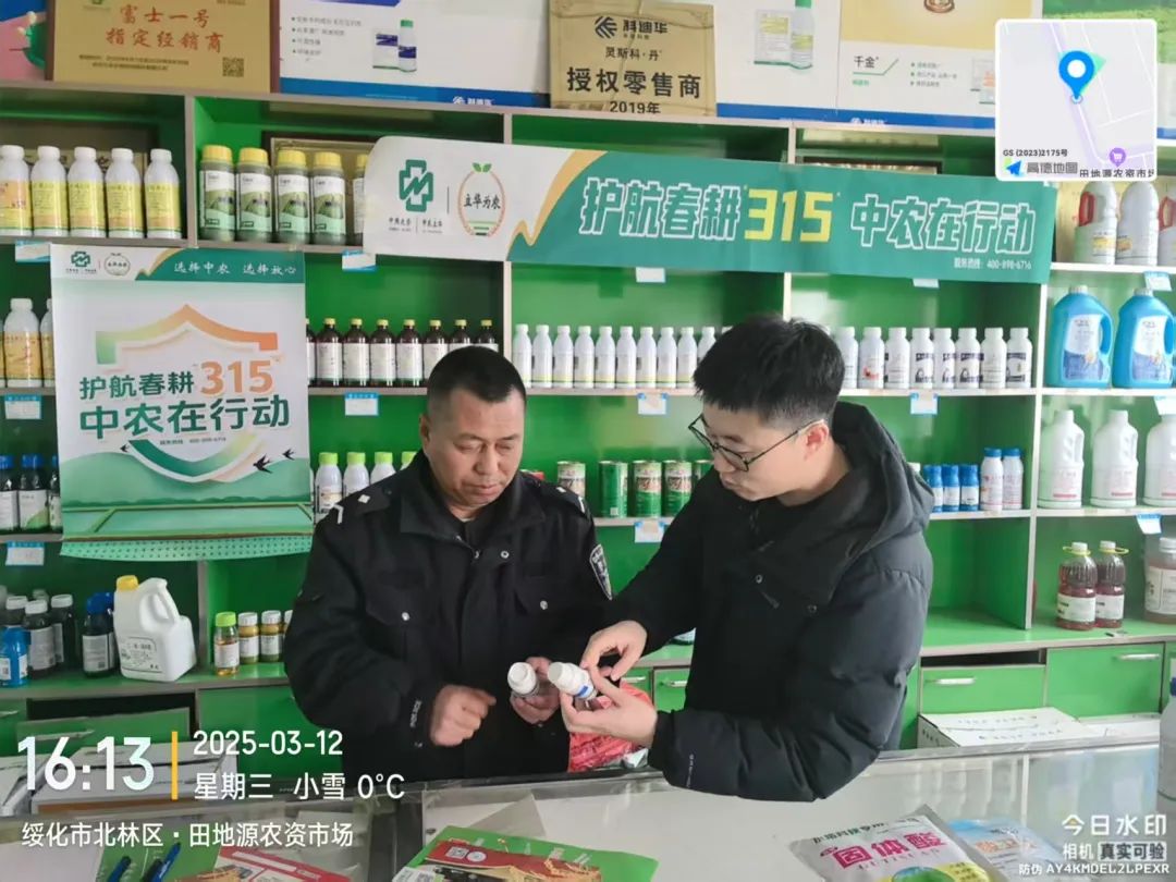 踏入农资门店,“护航春耕 315中农在行动”的标语如春日旌旗,醒目悬挂。在齐齐哈尔,中农立华黑龙江团队技术员孙喜臣正与店老板俯身查看货架。“这批杀菌剂的防伪码得再核验一遍,可别让农户买到‘李鬼’。”他手指轻点包装上的溯源标识:“您看,扫码后不仅能查流向,还能比对批次信息,这就是咱们的‘双保险’。”